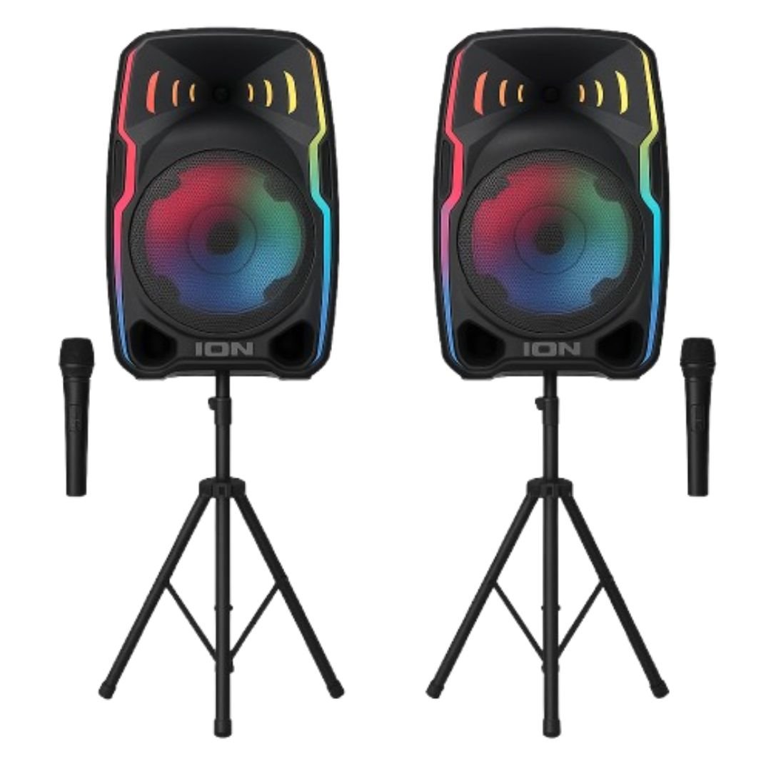 Battery-Powered Bluetooth PA Speakers with Stands, 2 Wireless Microphones & LED Lights